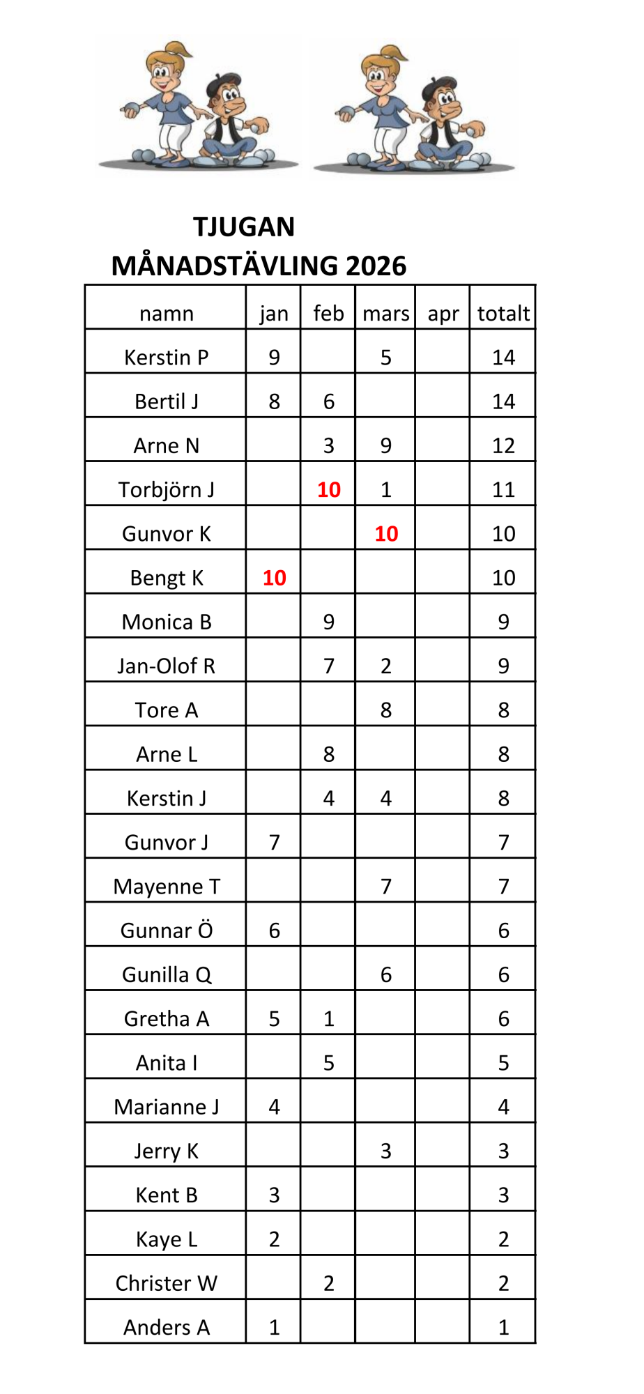 Tjugan samlade 26 spelare, Kerstin Persson leder totalen före Bertil Johansson trea är Arne Nilsson